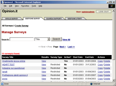 Identificandoti con username e password puoi accedere al pannello di controllo per creare, modificare, attivare o disattivare le tue survey.